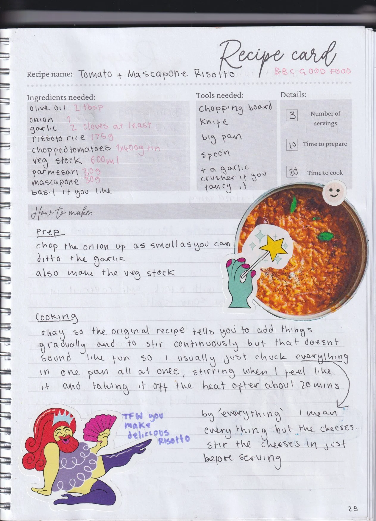 Okay so the original recipe tells you to add things gradually and to stir continuously but that doesn’t sound like fun so I usually just chuck everything (but the cheeses) in one pan all at once, stirring it when I feel like it and taking it off the heat after about 20 mins.